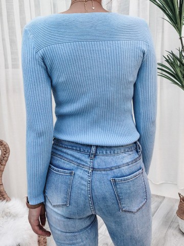 Blue V-Neck Long Sleeve Hollow Knitted Sweater