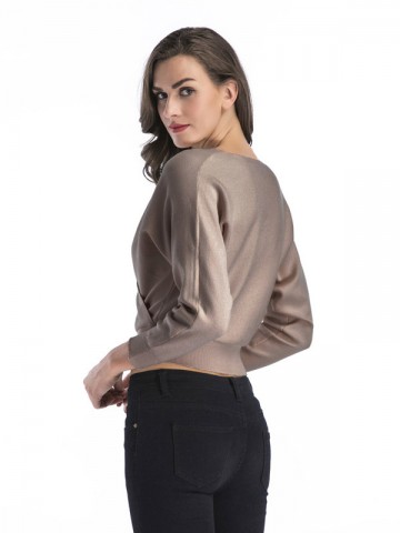 Khaki Short Loose Bat Sleeve Plunge V-Neck Sweater