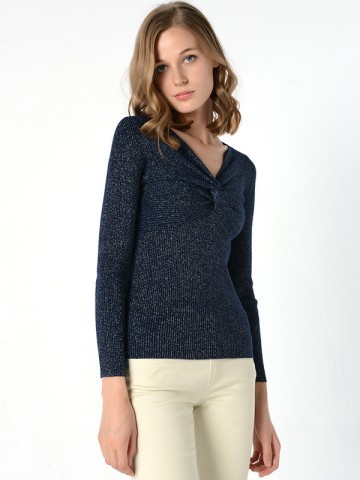 Blue Thick Flared Sleeve Scoop Neck Sweater with Stud Beads