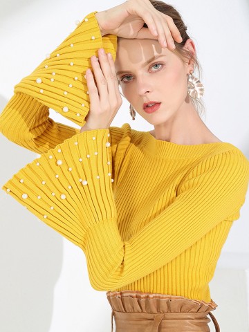 Yellow Thick Flared Sleeve Scoop Neck Sweater with Stud Beads