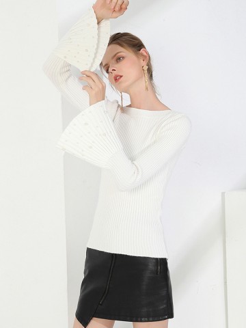 White Thick Flared Sleeve Scoop Neck Sweater with Stud Beads
