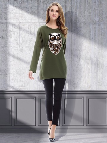 Green Loose Crew Bat Sleeve Owl Long Sleeve Sweater
