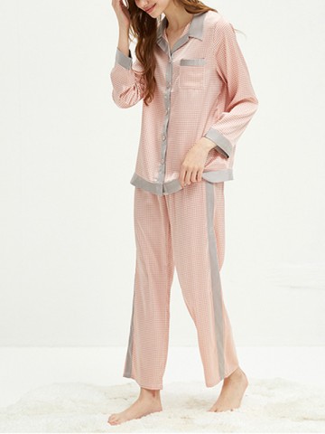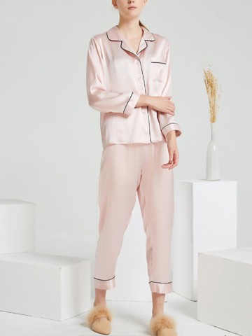 Pink Classic Trimmed Satin Long Sleeves Pajama Set