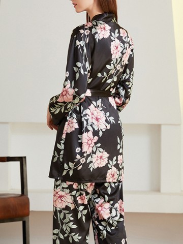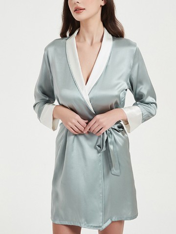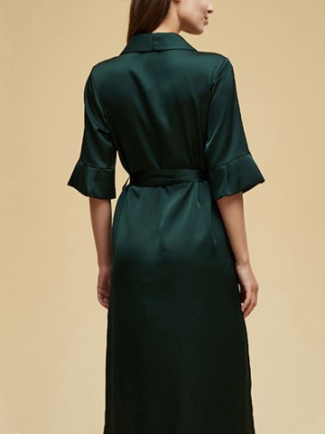 Green Shawl Collar Trimmed Satin Robe with Tie Wasit