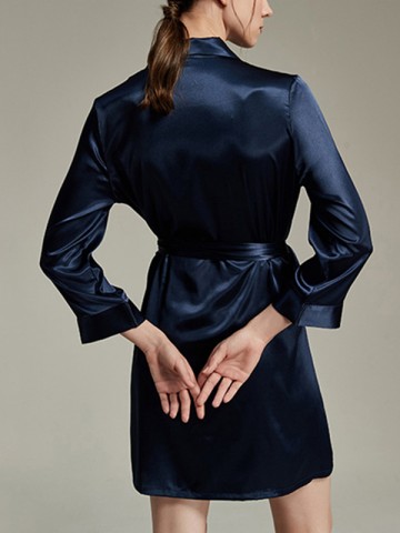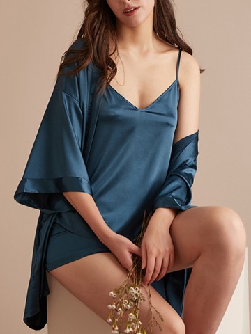 Navy Blue Embroidery Lace Nightdress and Robe Set
