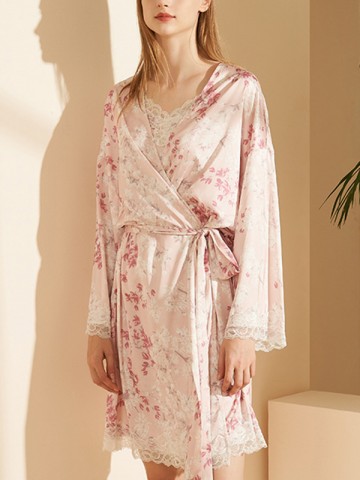 Purple Floral Hollow Out Lace Nightdress and Robe Set