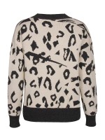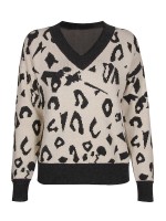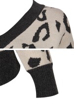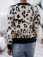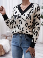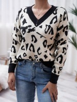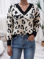 White Casual V-Neck Long Sleeve Leopard Knitted Sweater