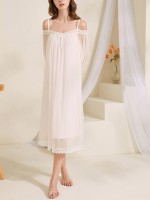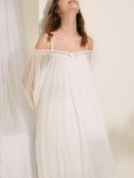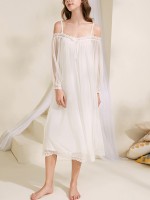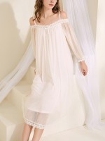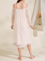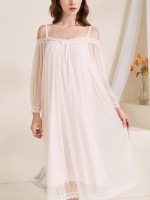 White Off-the-shoulder Mesh Long Sleeves Nightgown