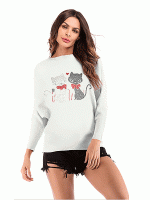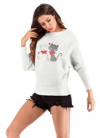 White Oversize Cats Pattern Crew Neck Knitted Sweater