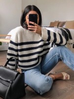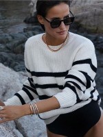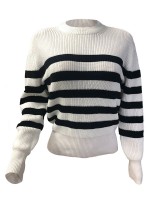 White Round Neck Stripes Pattern Knit Sweaters