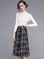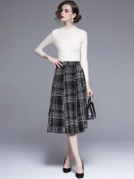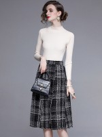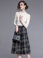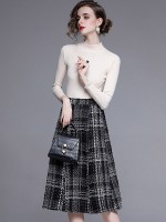 White Stand Collar Knit Top with Plaid Skirt